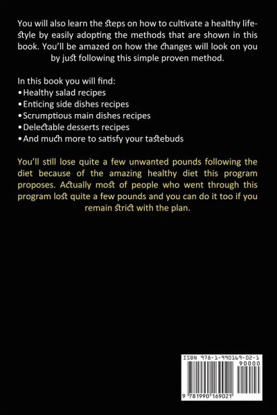 You will also learn the steps on how to cultivate a healthy lifestyle by easily adopting the methods that are shown in this book. You'll be amazed on how the changes will look on you by just following this simple proven method. In this book you will find: Healthy salad recipes Enticing side dishes recipes Scrumptious main dishes recipes Delectable desserts recipes And much more to satisfy your tastebuds You'll still lose quite a few unwanted pounds following the diet because of the amazing healthy diet this program proposes. Actually most of people who went through this program lost quite a few pounds and you can do it too if you remain strict with the plan.