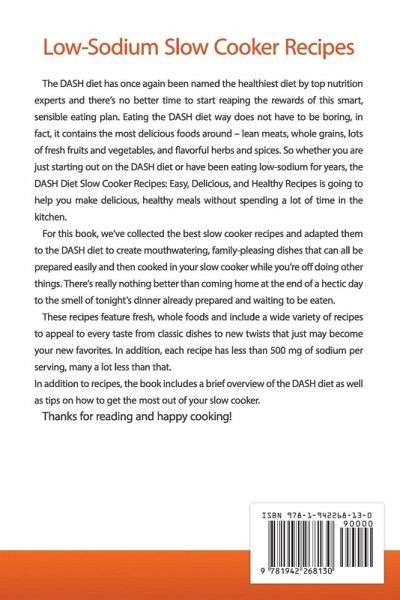 The DASH diet has once again been named the healthiest diet by top nutrition experts and there's no better time to start reaping the rewards of this smart, sensible eating plan. Eating the DASH diet way does not have to be boring, in fact, it contains the most delicious foods around - lean meats, whole grains, lots of fresh fruits and vegetables, and flavorful herbs and spices. So whether you are just starting out on the DASH diet or have been eating low-sodium for years, the DASH Diet Slow Cooker Recipes: Easy, Delicious, and Healthy Recipes is going to help you make delicious, healthy meals without spending a lot of time in the kitchen. For this book, we've collected the best slow cooker recipes and adapted them to the DASH diet to create mouthwatering, family-pleasing dishes that can all be prepared easily and then cooked in your slow cooker while you're off doing other things. There's really nothing better than coming home at the end of a hectic day to the smell of tonight's dinner already prepared and waiting to be eaten. These recipes feature fresh, whole foods and include a wide variety of recipes to appeal to every taste from classic dishes to new twists that just may become your new favorites. In addition, each recipe has less than 500 mg of sodium per serving, many a lot less than that. In addition to recipes, the book includes a brief overview of the DASH diet as well as tips on how to get the most out of your slow cooker. Thanks for reading and happy cooking!