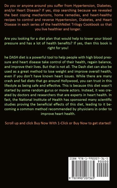 Do you or anyone around you suffer from Hypertension, Diabetes, and/or Heart Disease? If yes, stop searching because we revealed the best coping mechanisms, home remedies, and heart-healthy recipes to control and reverse Hypertension, Diabetes, and Heart Disease in each series of the healthNdiet Trilogy Cookbook so that you live healthier and longer. Are you looking for a diet plan that would help to lower your blood pressure and has a lot of health benefits? If yes, then this book is right for you! he DASH diet is a powerful tool to help people with high blood pressure and heart disease take control of their health, regain balance, and improve their lives. But that is not all. The Dash diet can also be used as a great method to lose weight and improve overall health, even if you don't have known heart issues. While there are many crash and fad diets that go around Hollywood, you can trust in this lifestyle as being safe and effective. This is because this diet wasn't started by some random gurus or movie actors. Instead, it was created by doctors and researchers that are experts in heart health. In fact, the National Institute of Health has sponsored many scientific studies proving the beneficial effects of this diet, leading to it becoming a common method recommended by physicians in order to improve heart health. Scroll up and click Buy Now With 1-Click or Buy Now to get started!