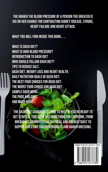 The higher the blood pressure of a person the greater is his or her chance for contracting kidney disease, stroke, heart failure and heart attack. What you will find inside this book... .. What is DASH diet? What is high blood pressure? Introduction to DASH diet Who should follow DASH diet? Tips to reduce salt. DASH diet, weight loss and heart health. Daily nutrition goals of DASH diet. The Best food choices for DASH diet. The Worst food choice for DASH diet. Sample DASH menu. The Pros and Cons. And much more.... The Dash Diet Cookbook is here to help if you're ready to get started. This book has something for everyone, from breakfast favorites like oatmeal and French toast to supper sides like zucchini noodles and ranch dressing.