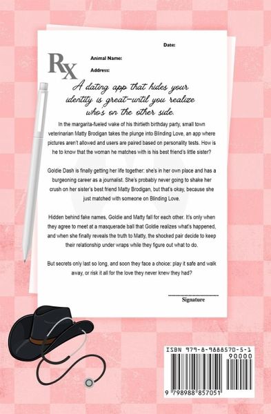 A dating app that hides your identity is great-until you realize who's on the other side. In the margarita-fueled wake of his thirtieth birthday party, small town veterinarian Matty Brodigan takes the plunge into Blinding Love, an app where pictures aren't allowed and users are paired based on personality tests. How is he to know that the woman he matches with is his best friend's little sister? Goldie Dash is finally getting her life together: she's in her own place and has a burgeoning career as a journalist. She's probably never going to shake her crush on her sister's best friend Matty Brodigan, but that's okay, because she just matched with someone on Blinding Love. Hidden behind fake names, Goldie and Matty fall for each other. It's only when they agree to meet at a masquerade ball that Goldie realizes what's happened, and when she finally reveals the truth to Matty, the shocked pair decide to keep their relationship under wraps while they figure out what to do. But secrets only last so long, and soon they face a choice: play it safe and walk away, or risk it all for the love they never knew they had?
