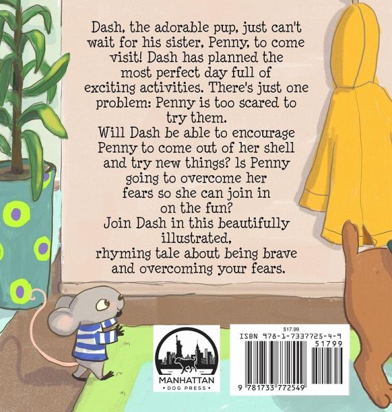 Dash, the adorable pup, just can't wait for his sister, Penny, to come visit! Dash has planned the most perfect day full of exciting activities. There's just one problem: Penny is too scared to try them. Will Dash be able to encourage Penny to come out of her shell and try new things? ls Penny going to overcome her fears so she can join in on the fun? Join Dash in this beautifully illustrated, rhyming tale about being brave and overcoming your fears.
