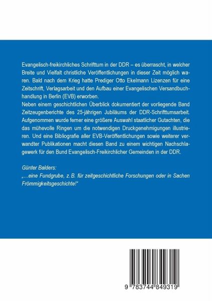 Evangelisch-freikirchliches Schrifttum in der DDR - es überrascht, in welcher Breite und Vielfalt christliche Veröffentlichungen in dieser Zeit möglich waren. Bald nach dem Krieg hatte Prediger Otto Ekelmann Lizenzen für eine Zeitschrift, Verlagsarbeit und den Aufbau einer Evangelischen Versandbuchhandlung in Berlin (EVB) erworben. Neben einem Überblick über diese Geschichte dokumentiert der vorliegende Band u.a. bewegende Zeitzeugenberichte des 25-jährigen Jubiläums der DDR-Schrifttumsarbeit. Aufgenommen wurde ferner eine große Auswahl staatlicher Gutachten, die das oft mühevolle Ringen um Genehmigungen aufzeigt. Und eine Bibliografie aller EVB-Veröffentlichungen sowie weiterer baptistischer Publikationen macht diesen Band zu einem wichtigen Nachschlagewerk für den Bund Evangelisch-Freikirchlicher Gemeinden in der DDR.Günter Balders: "...eine Fundgrube, z.B. für zeitgeschichtliche Forschungen oder in Sachen Frömmigkeitsgeschichte!"