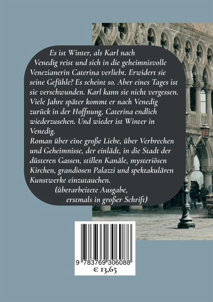 Es ist Winter, als Karl nach Venedig reist und sich in die geheimnisvolle Venezianerin Caterina verliebt. Erwidert sie seine Gefühle? Es scheint so. Aber eines Tages ist sie verschwunden. Karl kann sie nicht vergessen. Viele Jahre später kommt er nach Venedig zurück in der Hoffnung, Caterina endlich wiederzusehen. Und wieder ist Winter in Venedig. Roman über eine große Liebe, über Verbrechen und Geheimnisse, der einlädt, in die Stadt der düsteren Gassen, stillen Kanäle, mysteriösen Kirchen, grandiosen Palazzi und spektakulären Kunstwerke einzutauchen. (überarbeitete Ausgabe, erstmals in großer Schrift)
