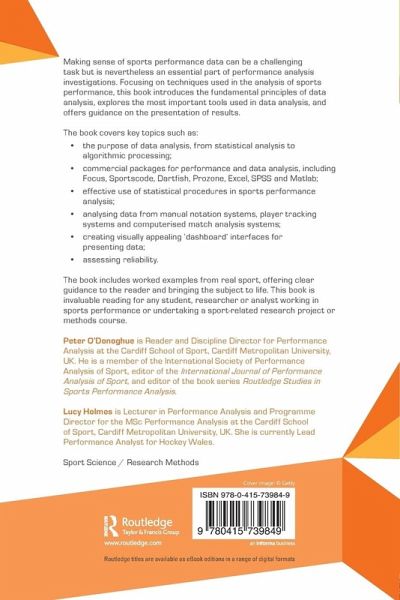 Making sense of sports performance data can be a challenging task but is nevertheless an essential part of performance analysis investigations. Focusing on techniques used in the analysis of sport performance, this book introduces the fundamental principles of data analysis, explores the most important tools used in data analysis, and offers guidance on the presentation of results. The book covers key topics such as: The purpose of data analysis, from statistical analysis to algorithmic processing Commercial packages for performance and data analysis, including Focus, Sportscode, Dartfish, Prozone, Excel, SPSS and Matlab Effective use of statistical procedures in sport performance analysis Analysing data from manual notation systems, player tracking systems and computerized match analysis systems Creating visually appealing 'dashboard' interfaces for presenting data Assessing reliability. The book¿includes worked examples from real sport, offering clear guidance to the reader and bringing the subject to life. This book is invaluable reading for any student, researcher or analyst working in sport performance or undertaking a sport-related research project or methods course