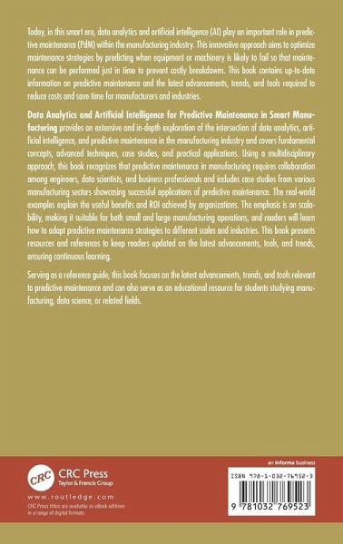 Today, in this smart era, data analytics and artificial intelligence (AI) play an important role in predictive maintenance (PdM) within the manufacturing industry. This innovative approach aims to optimize maintenance strategies by predicting when equipment or machinery is likely to fail so that maintenance can be performed just in time to prevent costly breakdowns. This book contains up-to-date information on predictive maintenance and the latest advancements, trends, and tools required to reduce costs and save time for manufacturers and industries.