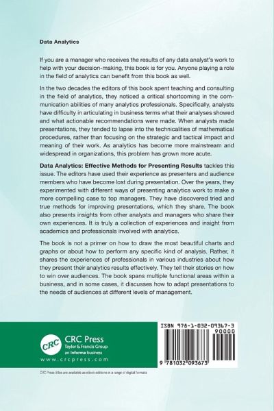 If you are a manager who receives the results of any data analyst's work to help with your decision-making, this book is for you. Anyone playing a role in the field of analytics can benefit from this book as well. In the two decades the editors of this book spent teaching and consulting in the field of analytics, they noticed a critical shortcoming in the communication abilities of many analytics professionals. Specifically, analysts have difficulty in articulating in business terms what their analyses showed and what actionable recommendations were made. When analysts made presentations, they tended to lapse into the technicalities of mathematical procedures, rather than focusing on the strategic and tactical impact and meaning of their work. As analytics has become more mainstream and widespread in organizations, this problem has grown more acute. Data Analytics: Effective Methods for Presenting Results tackles this issue. The editors have used their experience as presenters and audience members who have become lost during presentation. Over the years, they experimented with different ways of presenting analytics work to make a more compelling case to top managers. They have discovered tried and true methods for improving presentations, which they share. The book also presents insights from other analysts and managers who share their own experiences. It is truly a collection of experiences and insight from academics and professionals involved with analytics. The book is not a primer on how to draw the most beautiful charts and graphs or about how to perform any specific kind of analysis. Rather, it shares the experiences of professionals in various industries about how they present their analytics results effectively. They tell their stories on how to win over audiences. The book spans multiple functional areas within a business, and in some cases, it discusses how to adapt presentations to the needs of audiences at different levels of management.