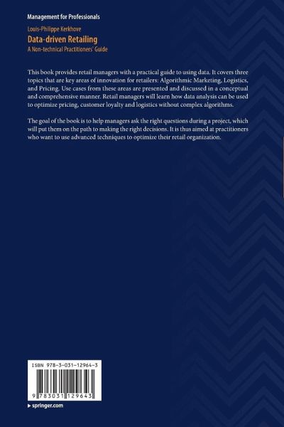This book provides retail managers with a practical guide to using data. It covers three topics that are key areas of innovation for retailers: Algorithmic Marketing, Logistics, and Pricing. Use cases from these areas are presented and discussed in a conceptual and comprehensive manner. Retail managers will learn how data analysis can be used to optimize pricing, customer loyalty and logistics without complex algorithms.