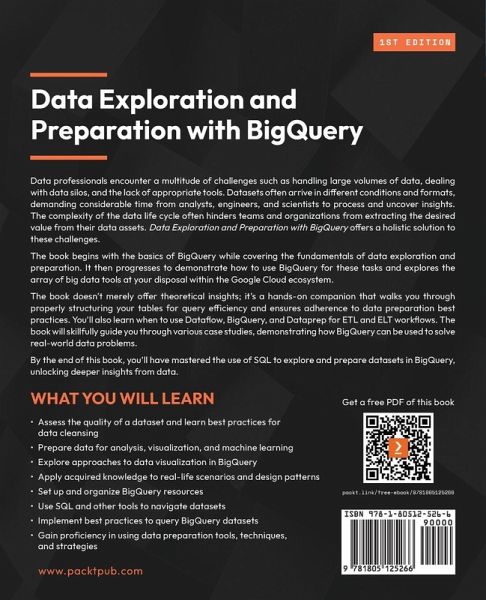 Leverage BigQuery to understand and prepare your data to ensure that it's accurate, reliable, and ready for analysis and modelingKey FeaturesUse mock datasets to explore data with the BigQuery web UI, bq CLI, and BigQuery API in the Cloud console Master optimization techniques for storage and query performance in BigQuery Engage with case studies on data exploration and preparation for advertising, transportation, and customer support data Purchase of the print or Kindle book includes a free PDF eBook Book Description Data professionals encounter a multitude of challenges such as handling large volumes of data, dealing with data silos, and the lack of appropriate tools. Datasets often arrive in different conditions and formats, demanding considerable time from analysts, engineers, and scientists to process and uncover insights. The complexity of the data life cycle often hinders teams and organizations from extracting the desired value from their data assets. Data Exploration and Preparation with BigQuery offers a holistic solution to these challenges. The book begins with the basics of BigQuery while covering the fundamentals of data exploration and preparation. It then progresses to demonstrate how to use BigQuery for these tasks and explores the array of big data tools at your disposal within the Google Cloud ecosystem. The book doesn't merely offer theoretical insights; it's a hands-on companion that walks you through properly structuring your tables for query efficiency and ensures adherence to data preparation best practices. You'll also learn when to use Dataflow, BigQuery, and Dataprep for ETL and ELT workflows. The book will skillfully guide you through various case studies, demonstrating how BigQuery can be used to solve real-world data problems. By the end of this book, you'll have mastered the use of SQL to explore and prepare datasets in BigQuery, unlocking deeper insights from data.What you will learnAssess the quality of a dataset and learn best practices for data cleansing Prepare data for analysis, visualization, and machine learning Explore approaches to data visualization in BigQuery Apply acquired knowledge to real-life scenarios and design patterns Set up and organize BigQuery resources Use SQL and other tools to navigate datasets Implement best practices to query BigQuery datasets Gain proficiency in using data preparation tools, techniques, and strategies Who this book is for This book is for data analysts seeking to enhance their data exploration and preparation skills using BigQuery. It guides anyone using BigQuery as a data warehouse to extract business insights from large datasets. A basic understanding of SQL, reporting, data modeling, and transformations will assist with understanding the topics covered in this book.Table of ContentsIntroducing BigQuery and Its Components BigQuery Organization and Design Exploring Data in BigQuery Loading and Transforming Data Querying BigQuery Data Exploring Data with Notebooks Further Exploring and Visualizing Data An Overview of Data Preparation Tools Cleansing and Transforming Data Best Practices for Data Preparation, Optimization, and Cost Control Hands-On Exercise - Analyzing Advertising Data Hands-On Exercise Analyzing Transportation Data Hands-On Exercise - Analyzing Customer Support Data Summary and Future Directions
