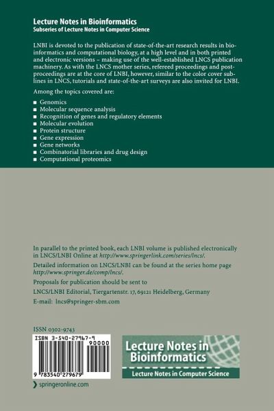 Keynotes.- Challenges in Biological Data Integration in the Post-genome Sequence Era.- Curated Databases.- User Applications.- A User-Centric Framework for Accessing Biological Sources and Tools.- BioLog: A Browser Based Collaboration and Resource Navigation Assistant for BioMedical Researchers.- Learning Layouts of Biological Datasets Semi-automatically.- Ontologies.- Factors Affecting Ontology Development in Ecology.- Querying Ontologies in Relational Database Systems.- Scientific Names Are Ambiguous as Identifiers for Biological Taxa: Their Context and Definition Are Required for Accurate Data Integration.- The Multiple Roles of Ontologies in the BioMediator Data Integration System.- Data Integration I-IV.- Integrating Heterogeneous Microarray Data Sources Using Correlation Signatures.- Knowledge-Based Integrative Framework for Hypothesis Formation in Biochemical Networks.- Semantic Correspondence in Federated Life Science Data Integration Systems.- Assigning Unique Keys to Chemical Compounds for Data Integration: Some Interesting Counter Examples.- Integrating and Warehousing Liver Gene Expression Data and Related Biomedical Resources in GEDAW.- Information Integration and Knowledge Acquisition from Semantically Heterogeneous Biological Data Sources.- Cluster Based Integration of Heterogeneous Biological Databases Using the AutoMed Toolkit.- Hybrid Integration of Molecular-Biological Annotation Data.- Setup and Annotation of Metabolomic Experiments by Integrating Biological and Mass Spectrometric Metadata.- Performance-Oriented Privacy-Preserving Data Integration.- Potpourri.- Building a Generic Platform for Medical Screening Applications Based on Domain Specific Modeling and Process Orientation.- Automatic Generation of Data Types for Classification of Deep WebSources.- BioNavigation: Selecting Optimum Paths Through Biological Resources to Evaluate Ontological Navigational Queries.- Posters and Demonstrations.- Support for BioIndexing in BLASTgres.- An Environment to Define and Execute In-Silico Workflows Using Web Services.- Web Service Mining for Biological Pathway Discovery.- SemanticBio: Building Conceptual Scientific Workflows over Web Services.- PLATCOM: Current Status and Plan for the Next Stages.- SOAP API for Integrating Biological Interaction Databases.- Collaborative Curation of Data from Bio-medical Texts and Abstracts and Its integration.- Towards an Ontology Based Visual Query System.- Invited Briefings.- Data Integration in the Biomedical Informatics Research Network (BIRN).- Data Integration and Workflow Solutions for Ecology.- Eco-Informatics for Decision Makers Advancing a Research Agenda.- An Architecture and Application for Integrating Curation Data at the Residue Level for Proteins.- The Biozon System for Complex Analysis of Heterogeneous Interrelated Biological Data and Discovery of Emergent Structures.