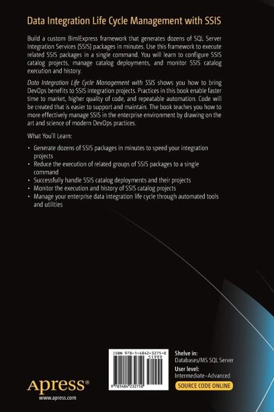 Data Integration Life Cycle Management with SSIS shows you how to bring DevOps benefits to SSIS integration projects. Practices in this book enable faster time to market, higher quality of code, and repeatable automation. Code will be created that is easier to support and maintain. The book teaches you how to more effectively manage SSIS in the enterprise environment by drawing on the art and science of modern DevOps practices.