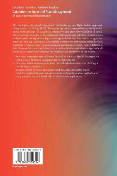 This book presents a step by step Asset Health Management Optimization Approach Using Internet of Things (IoT). The authors provide a comprehensive study which includes the descriptive, diagnostic, predictive, and prescriptive analysis in detail. The presentation focuses on the challenges of the parameter selection, statistical data analysis, predictive algorithms, big data storage and selection, data pattern recognition, machine learning techniques, asset failure distribution estimation, reliability and availability enhancement, condition based maintenance policy, failure detection, data driven optimization algorithm, and a multi-objective optimization approach, all of which can significantly enhance the reliability and availability of the system.
