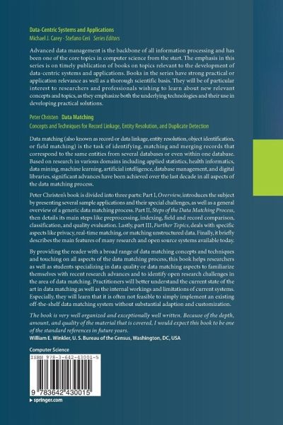 Peter Christen's book is divided into three parts: Part I, "Overview", introduces the subject by presenting several sample applications and their special challenges, as well as a general overview of a generic data matching process. Part II, "Steps of the Data Matching Process", then details its main steps like pre-processing, indexing, field and record comparison, classification, and quality evaluation. Lastly, part III, "Further Topics", deals with specific aspects like privacy, real-time matching, or matching unstructured data. Finally, it briefly describes the main features of many research and open source systems available today.