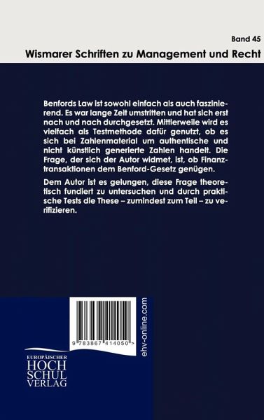 Benfords Law ist sowohl einfach als auch faszinierend. Es war lange Zeit umstritten und hat sich erst nach und nach durchgesetzt. Mittlerweile wird es vielfach als Testmethode dafür genutzt, ob es sich bei Zahlenmaterial um authentische und nicht künstlich generierte Zahlen handelt. Die Frage, der sich der Autor widmet, ist, ob Finanztransaktionen dem Benford-Gesetz genügen. Dem Autor ist es gelungen, diese Frage theoretisch fundiert zu untersuchen und durch praktische Tests die These zumindest zum Teil zu verifizieren.
