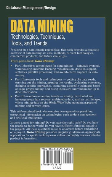 Focusing on a data-centric perspective, this book provides a complete overview of data mining: its uses, methods, current technologies, commercial products, and future challenges. Three parts divide Data Mining: Part I describes technologies for data mining - database systems, warehousing, machine learning, visualization, decision support, statistics, parallel processing, and architectural support for data mining. Part II presents tools and techniques - getting the data ready, carrying out the mining, pruning the results, evaluating outcomes, defining specific approaches, examining a specific technique based on logic programming, and citing literature and vendors for up-to-date information. Part III examines emerging trends - mining distributed and heterogeneous data sources; multimedia data, such as text, images, video; mining data on the World Wide Web; metadata aspects of mining; and privacy issues. This self-contained book also contains two appendices providing exceptional information on technologies, such as data management, and artificial intelligence. Is there a need for mining? Do you have the right tools? Do you have the people to do the work? Do you have sufficient funds allocated to the project? All these answers must be answered before embarking on a project. Data Mining provides singular guidance on appropriate applications for specific techniques as well as thoroughly assesses valuable product information. TOC:Overview.- Data Minig technologies.- Types of data Mining.- Techniques for data mining.- Models for data mining.- Prototypes.- Products.- Data mining and the WWW.- Security, privacy, integrity, and quality.- Application Domains.- Challenges in data mining.- Conclusion.