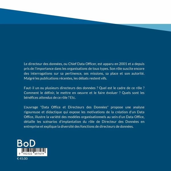 Le directeur des données, ou Chief Data Officer, est apparu en 2001 et a depuis pris de l'importance dans les organisations de tous types. Son rôle suscite encore des interrogations sur sa pertinence, ses missions, sa place et son autorité. Malgré les publications récentes, les débats restent vifs.Faut-il un ou plusieurs directeurs des données ? Quel est le cadre de ce rôle ? Comment le définir, le mettre en oeuvre et le faire évoluer ? Quels sont les bénéfices attendus de ce rôle ? Etc.L'ouvrage "Data Office et Directeurs des Données" propose une analyse rigoureuse et didactique qui expose les motivations de la création d'un Data Office, illustre la variété des modèles organisationnels au sein d'un Data Office, détaille les scénarios d'implantation du rôle de Directeur des Données en entreprise et explique la diversité des fonctions de directeurs de données.