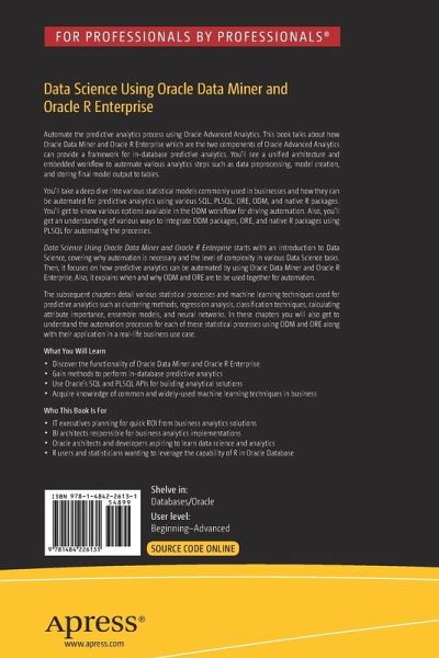 Data Science Automation Using Oracle Data Miner and Oracle R Enterprise starts with an introduction to business analytics, covering why automation is necessary and the level of complexity in automation at each analytic stage. Then, it focuses on how predictive analytics can be automated by using Oracle Data Miner and Oracle R Enterprise. Also, it explains when and why ODM and ORE are to be used together for automation.