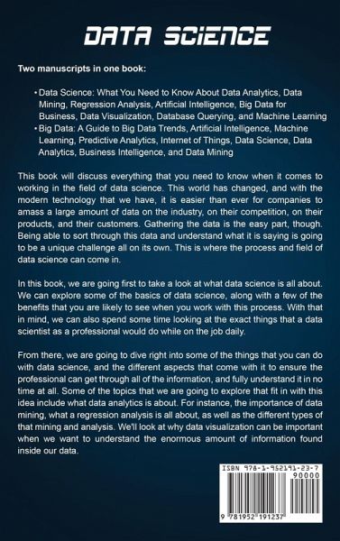 If you want to learn about data science and big data, then keep reading... Two manuscripts in one book: Data Science: What You Need to Know About Data Analytics, Data Mining, Regression Analysis, Artificial Intelligence, Big Data for Business, Data Visualization, Database Querying, and Machine Learning Big Data: A Guide to Big Data Trends, Artificial Intelligence, Machine Learning, Predictive Analytics, Internet of Things, Data Science, Data Analytics, Business Intelligence, and Data Mining This book will discuss everything that you need to know when it comes to working in the field of data science. This world has changed, and with the modern technology that we have, it is easier than ever for companies to amass a large amount of data on the industry, on their competition, on their products, and their customers. Gathering the data is the easy part, though. Being able to sort through this data and understand what it is saying is going to be a unique challenge all on its own. This is where the process and field of data science can come in. There is so much that we can explore and learn about when it comes to the world of data science, and this ultimate guide is here to help you navigate through these specialties. You will see just how important the ideas of data mining, data analytics, and even artificial intelligence are to our world as a whole today. Some of the topics covered in part 1 of this book include: What is Data Science? What Exactly Does a Data Scientist Do? A Look at What Data Analytics Is All About What is Data Mining and How Does It Fit in with Data Science? Regression Analysis Why is Data Visualization So Important When It Comes to Understanding Your Data? How to work with Database Querying A Look at Artificial Intelligence What is Machine Learning and How Is It Different from Artificial Intelligence? What is the Future of Artificial Intelligence and Machine Learning? And much more! Some of the topics covered in part 2 of this book include: What is big data, and why is it important? The five V’s behind big data How big data is already impacting your life, and where big data may be headed How big data and your everyday devices and appliances will come together in unexpected ways via the Internet of Things How companies and governments are using predictive analytics to get ahead of the competition or improve service How big data is used for fraud detection How big data can train intelligent computer systems The many ways large corporations are benefiting from big data and the tools that use it like machine learning, AI, and predictive analytics Upcoming trends in big data that are sure to have a large impact on your future Artificial intelligence, and how big data drives its development What machine learning is and how it is tied to big data The relationship between big data, data analytics, and business intelligence Insights into how big data impacts privacy issues The pros and cons regarding big data And much, much more! So if you want to learn more about data science and big data, click the "add to cart" button!