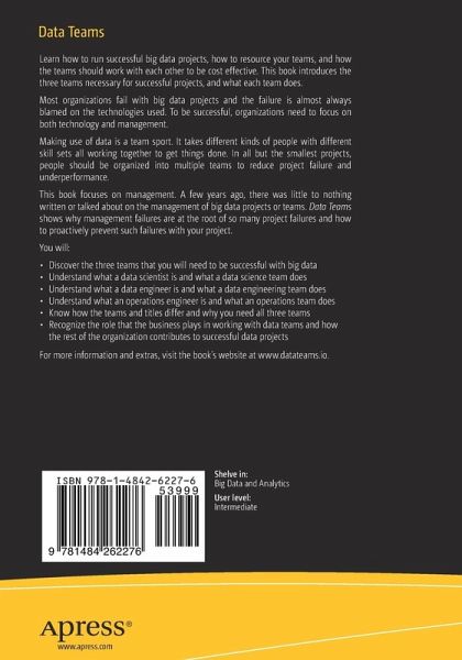 This book focuses on management. A few years ago, there was little to nothing written or talked about on the management of big data projects or teams. Data Teams shows why management failures are at the root of so many project failures and how to proactively prevent such failures with your project.