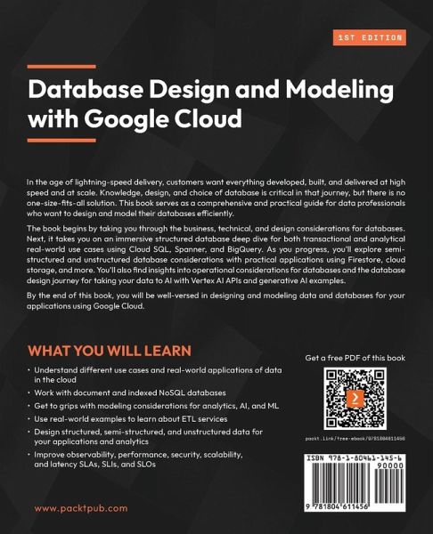 Build faster and efficient real-world applications on the cloud with a fitting database model that's perfect for your needsKey FeaturesFamiliarize yourself with business and technical considerations involved in modeling the right database Take your data to applications, analytics, and AI with real-world examples Learn how to code, build, and deploy end-to-end solutions with expert advice Purchase of the print or Kindle book includes a free PDF eBook Book Description In the age of lightning-speed delivery, customers want everything developed, built, and delivered at high speed and at scale. Knowledge, design, and choice of database is critical in that journey, but there is no one-size-fits-all solution. This book serves as a comprehensive and practical guide for data professionals who want to design and model their databases efficiently. The book begins by taking you through business, technical, and design considerations for databases. Next, it takes you on an immersive structured database deep dive for both transactional and analytical real-world use cases using Cloud SQL, Spanner, and BigQuery. As you progress, you'll explore semi-structured and unstructured database considerations with practical applications using Firestore, cloud storage, and more. You'll also find insights into operational considerations for databases and the database design journey for taking your data to AI with Vertex AI APIs and generative AI examples. By the end of this book, you will be well-versed in designing and modeling data and databases for your applications using Google Cloud.What you will learnUnderstand different use cases and real-world applications of data in the cloud Work with document and indexed NoSQL databases Get to grips with modeling considerations for analytics, AI, and ML Use real-world examples to learn about ETL services Design structured, semi-structured, and unstructured data for your applications and analytics Improve observability, performance, security, scalability, latency SLAs, SLIs, and SLOs Who this book is for This book is for database developers, data engineers, and architects looking to design, model, and build database applications on the cloud with an extended focus on operational consideration and taking their data to AI. Data scientists, as well ML and AI engineers who want to use Google Cloud services in the data to AI journey will also find plenty of useful information in this book. It will also be useful to data analysts and BI developers who want to use SQL impactfully to generate ML and generative AI insights from their data. Table of ContentsData, Databases, and Design Handling Data on the Cloud Database Modeling for Structured Data Setting Up a Fully Managed RDBMS Designing an Analytical Data Warehouse Designing for Semi-structured Data Unstructured Data Management DevOps and Databases Data to AI - Modeling Your Databases for Analytics and ML Looking Ahead - Designing for LLM Applications