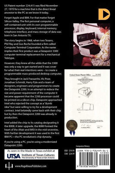 Forget Apple and IBM. For that matter forget Silicon Valley. The first personal computer, a self-contained unit with its own programmable processor, display, keyboard, internal memory, telephone interface, and mass storage of data was born in San Antonio TX. US Patent number 224,415 was filed November 27, 1970 for a machine that is the direct lineal ancestor to the PC as we know it today. The story begins in 1968, when two Texans, Phil Ray and Gus Roche, founded a firm called Computer Terminal Corporation. As the name implies their first product was a Datapoint 3300 computer terminal…mehr