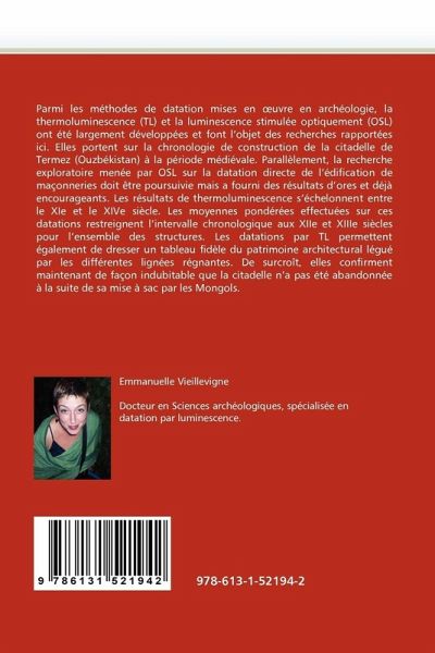 Parmi les méthodes de datation mises en uvre en archéologie, la thermoluminescence (TL) et la luminescence stimulée optiquement (OSL) ont été largement développées et font l'objet des recherches rapportées ici. Elles portent sur la chronologie de construction de la citadelle de Termez (Ouzbékistan) à la période médiévale. Parallèlement, la recherche exploratoire menée par OSL sur la datation directe de l'édification de maçonneries doit être poursuivie mais a fourni des résultats d'ores et déjà encourageants. Les résultats de thermoluminescence s'échelonnent entre le XIe et le XIVe siècle. Les moyennes pondérées effectuées sur ces datations restreignent l'intervalle chronologique aux XIIe et XIIIe siècles pour l'ensemble des structures. Les datations par TL permettent également de dresser un tableau fidèle du patrimoine architectural légué par les différentes lignées régnantes. De surcroît, elles confirment maintenant de façon indubitable que la citadelle n'a pas été abandonnée à la suite de sa mise à sac par les Mongols.