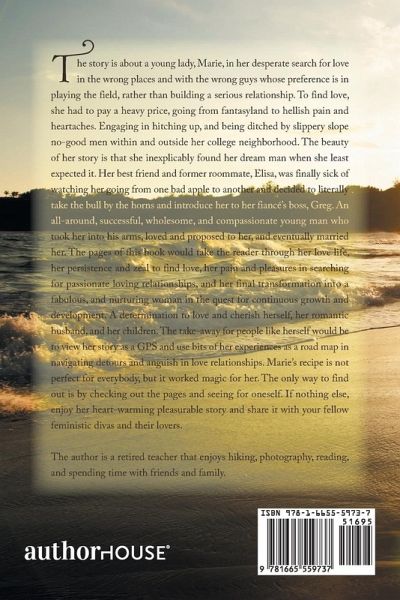 The story is about a young lady, Marie, in her desperate search for love in the wrong places and with the wrong guys whose preference is in playing the field, rather than building a serious relationship. To find love, she had to pay a heavy price, going from fantasyland to hellish pain and heartaches. Engaging in hitching up, and being ditched by slippery slope no-good men within and outside her college neighborhood. The beauty of her story is that she inexplicably found her dream man when she least expected it. Her best friend and former roommate, Elisa, was finally sick of watching her going from one bad apple to another and decided to literally take the bull by the horns and introduce her to her fiancé's boss, Greg. An all-around, successful, wholesome, and compassionate young man who took her into his arms, loved and proposed to her, and eventually married her. The pages of this book would take the reader through her love life, her persistence and zeal to find love, her pain and pleasures in searching for passionate loving relationships, and her final transformation into a fabulous, and nurturing woman in the quest for continuous growth and development. A determination to love and cherish herself, her romantic husband, and her children. The take-away for people like herself would be to view her story as a GPS and use bits of her experiences as a road map in navigating detours and anguish in love relationships. Marie's recipe is not perfect for everybody, but it worked magic for her. The only way to find out is by checking out the pages and seeing for oneself. If nothing else, enjoy her heart-warming pleasurable story and share it with your fellow feministic divas and their lovers.
