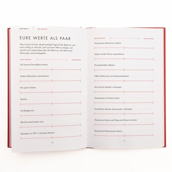 Zehn individuell gestaltete Date Nights laden euch dazu ein, gemeinsam eine Zeitreise in eure Vergangenheit und Zukunft zu unternehmen, über eure Beziehung zu reflektieren und sie wachsen zu lassen. Die Mischung aus Fragen und interaktiven Übungen zu verschiedenen Lebensbereichen ermöglicht es euch, einander von einer ganz neuen Seite kennenzulernen und eure Verbindung zu stärken. Was ist euch selbst als Person und als Paar wichtig? Was bewegt euch und was schätzt ihr besonders an eurem Gegenüber? Es geht um ehrliche und offene Kommunikation und darum, euch einander zu zeigen, wie ihr wirklich seid. Zehn außergewöhnliche Begegnungen für Paare, die Spaß machen und einige Überraschungen bereithalten.