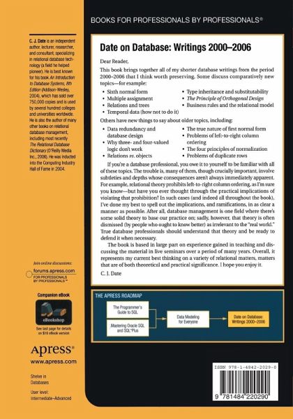 Date on Database: Writings 2000 2006 captures some of the freshest thinking from widely known and respected relational database pioneer C. J. Date. Known for his tenacious defense of relational theory in its purest form, Date tackles many topics that are important to database professionals, including the difference between model and implementation, data integrity, data redundancy, deviations in SQL from the relational model, and much more.