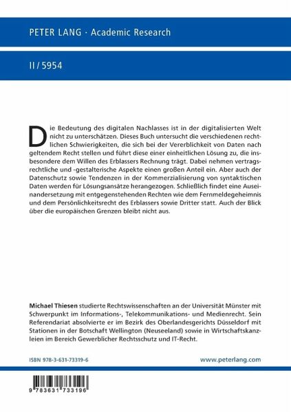 Die Bedeutung des digitalen Nachlasses ist in der digitalisierten Welt nicht zu unterschätzen. Dieses Buch untersucht die verschiedenen rechtlichen Schwierigkeiten, die sich bei der Vererblichkeit von Daten nach geltendem Recht stellen und führt diese einer einheitlichen Lösung zu, die insbesondere dem Willen des Erblassers Rechnung trägt. Dabei nehmen vertragsrechtliche und -gestalterische Aspekte einen großen Anteil ein. Aber auch der Datenschutz sowie Tendenzen in der Kommerzialisierung von syntaktischen Daten werden für Lösungsansätze herangezogen. Schließlich findet auch eine Auseinandersetzung mit entgegenstehenden Rechten wie dem Fernmeldegeheimnis sowie dem Persönlichkeitsrecht des Erblassers sowie Dritter statt. Auch der Blick über die europäischen Grenzen bleibt nicht aus.