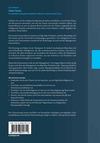 Dieses Buchkonzentriert sich auf das Management. Vor einigen Jahren wurde wenig bis gar nicht über das Management von Big-Data-Projekten oder -Teams geschrieben oder gesprochen. Data Teams zeigt, warum Managementfehler die Ursache für so viele Projektmisserfolge sind und wie Sie solche Misserfolge in Ihrem Projekt proaktiv verhindern können.
