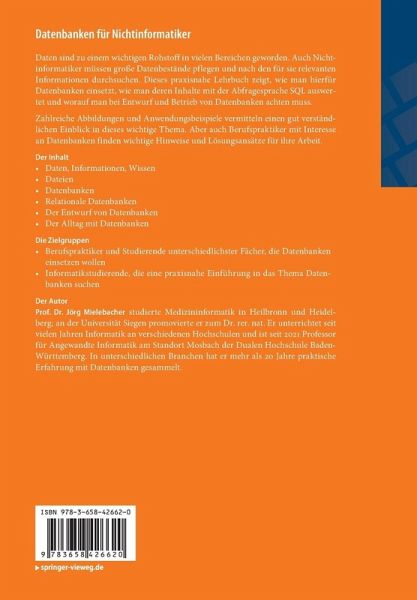 Daten sind zu einem wichtigen Rohstoff in vielen Bereichen geworden. Auch Nichtinformatiker müssen große Datenbestände pflegen und nach den für sie relevanten Informationen durchsuchen. Dieses praxisnahe Lehrbuch zeigt, wie man hierfür Datenbanken einsetzt, wie man deren Inhalte mit der Abfragesprache SQL auswertet und worauf man bei Entwurf und Betrieb von Datenbanken achten muss.