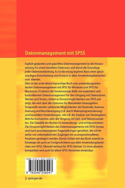 Dies ist das erste deutschsprachige Buch zum anwendungsorientierten Datenmanagement mit SPSS. Es hebt die fundamentale Rolle von explizitem und kontrolliertem Datenmanagement für die Analyse von Daten hervor, indem es beim Zugang zum Programm Einsatzmöglichkeiten von SPSS aufzeigt, die weit über die Optionen für Mauslenker hinausgehen. Die Didaktik des Buches ist dabei anwendungs- und erfolgsorientiert. Die Einsatzmöglichkeiten des Datenmanagements mit SPSS Syntax sind dabei nach praxisorientierten Fragestellungen geordnet, die wiederum von unkomplizierten Zugängen bis zu anspruchsvolleren Ansätzen gesteigert werden.