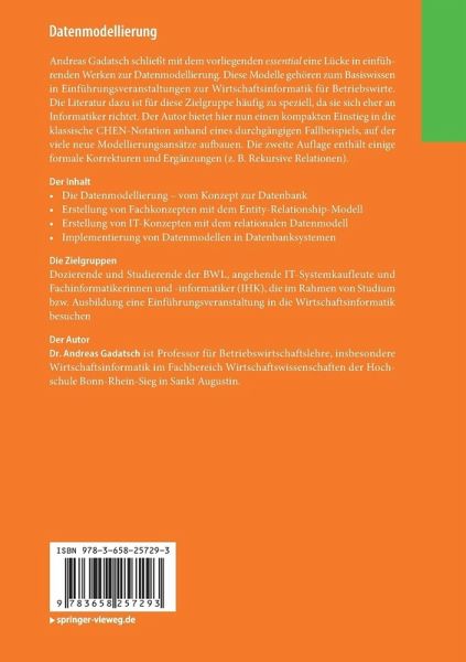 Andreas Gadatsch schließt mit dem vorliegenden essential eine Lücke in einführenden Werken zur Datenmodellierung. Diese Modelle gehören zum Basiswissen in Einführungsveranstaltungen zur Wirtschaftsinformatik für Betriebswirte. Die Literatur dazu ist für diese Zielgruppe häufig zu speziell, da sie sich eher an Informatiker richtet. Der Autor bietet hier nun einen kompakten Einstieg in die klassische CHEN-Notation anhand eines durchgängigen Fallbeispiels, auf der viele neue Modellierungsansätze aufbauen. Die zweite Auflage enthält einige formale Korrekturen und Ergänzungen (z. B. Rekursive Relationen).