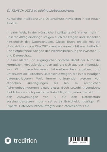 In einer Welt, in der KI-Technologien rasch fortschreiten und Datenschutzfragen immer wichtiger werden, bietet dieses Buch wertvolle Einblicke und praktische Lösungen. Dieses Buch ist das Ergebnis einer einzigartigen Kollaboration zwischen menschlichem Fachwissen und KI, und es verkörpert die Synergie, die entsteht, wenn Technologie und menschliche Kreativität zusammenkommen. Tiefgreifende Analysen der aktuellen und zukünftigen KI-Trends.Umfassende Betrachtungen der Datenschutzherausforderungen in der KI-Ära.Praktische Strategien zur Integration von Datenschutz in KI-Systeme.Ein einzigartiger Blick auf die Rolle von Datenschutzbeauftragten in dieser neuen Realität.Ideal für Fachleute, Entscheidungsträger, IT-Experten und alle, die sich für die Zukunft der KI und des Datenschutzes interessieren.