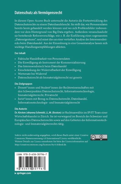 In diesem Open-Access-Buch untersucht die Autorin die Fortentwicklung des Datenschutzrechts zu einem Datenhandelsrecht. Sie stellt dar, wie Personendaten bereits heute gehandelt werden können und wo sich Problemfelder insbesondere vor dem Hintergrund von Big Data ergeben. Außerdem veranschaulicht sie bestehende Reformvorschläge, wie z. B. die Einführung eines sogenannten "Dateneigentums", und misst dies an einer vertieften Analyse des Interessendreiecks beim Datenhandel. Aus der Einordnung in eine Gesamtanalyse lassen sich wichtige Handlungsempfehlungen ableiten.