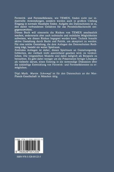 1 Einleitung.- 2 Charakteristika von TEMEX und ihre Bedeutung für den Daten- schutz.- 2.1 Vorbemerkungen.- 2.2 Technische Eigenschaften von TEMEX.- 2.3 Die Rechtsverhältnisse bei TEMEX.- 3 Risiken von TEMEX.- 3.1 Vorbemerkungen.- 3.2 Verbrauchsdatenerfassung.- 3.3 Notrufsysteme.- 3.4 Patientenüberwachung und medizinische Fernversorgung.- 3.5 Einbruchsmeldesysteme.- 3. 6 Fernwartung, Fernüberwachung und Fernsteuerung von Geräten im Haushaltsbereich.- 3.7 TEMEX-Nutzung für Zwecke der Verhaltensforschung.- 3.8 Fernüberwachung im Strafvollzug.- 3.9 Risiken bei mehreren TEMEX-Anwendungen.- 4 TEMEX und das allgemeine Recht.- 4.1 Vorbemerkungen.- 4.2 Wirkung der Grundrechte der Verfassung.- 4.3 Datenschutzrecht.- 4.4 Fragen der Haftung.- 4.5 Strafrechtliche Vorschriften.- 5 Spezielle Rechtsvorschriften für TEMEX.- 5.1 Vorbemerkungen.- 5.2 Anwendungsbereich der Regelungen.- 5.3 Einwilligung.- 5.4 Benachteiligungsverbot.- 5.5 Aufklärungspflicht.- 5.6 Kontrolle durch den TEMEX-Teil nehmer.- 5.7 Zweckbindung.- 5.8 Vorschriften der TKO.- 6 Modell einer anonymen Verbrauchsdatenerfassung.- 6.1 Vorbemerkungen.- 6.2 Protokoll basierend auf kryptographischen Verfahren.- 6.3 Grundzüge des Modells.- 6.4 Einzelfragen des Modells.- 6.5 Zusammenfassende Darstellung.- 6.6 Praktische Durchführbarkeit des Modells.- 6.7 Weitere Anwendungen ähnlicher Modelle.- 7 Prüf- und Zulassungsverfahren für TEMEX-Anwendungen.- 7.1 Notwendigkeit von Prüf- und Zulassungsverfahren.- 7.2 Inhalt von Datenschutz- und Sicherheitsstandards.- 7.3 Organisation der Entwicklung und Prüfung der Standards.- 7.4 Prüf- und Zulassungsverfahren.- 8 Zukünftige Entwicklungen.- 8.1 Vorbemerkungen.- 8.2 Mehrwertdienst: "Verwaltung von Pseudonymen zur Wahrung der Anonymität".- 8.3 Anwendung auf dieVerbrauchsdatenerfassung.- 8.4 Integrität und Vertraulichkeit der Datenübertragung.- 8.5 Einbeziehung eines anonymen Zahlungsverkehrs.- Verzeichnis der Abkürzungen.- Sachwortverzeichnis.
