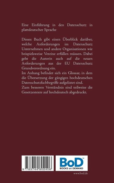Eine Einführung in den Datenschutz in plattdeutscher Sprache.Dieses Buch gibt einen Überblick darüber, welche Anforderungen im Datenschutz Unternehmen und andere Organisationen wie beispielsweise Vereine erfüllen müssen. Dabei geht die Autorin auch auf die neuen Anforderungen aus der EU Datenschutz Grundverordnung ein.Im Anhang befindet sich ein Glossar, in dem die Übersetzung der gängigen hochdeutschen Datenschutzfachbegriffe aufgelistet sind.Zum besseren Verständnis sind teilweise die Gesetzestexte auf hochdeutsch abgedruckt.
