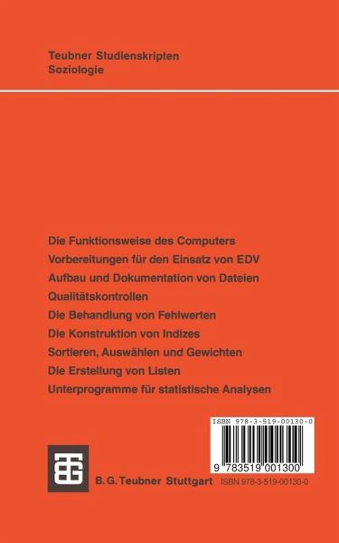 Aus dem Inhalt: Die Funktionsweise des Computers / Vorbereitungen für den Einsatz von EDV / Aufbau und Dokumentation von Dateien / Qualitätskontrollen / Die Behandlung von Fehlwerten / Die Konstruktion von Indizes / Sortieren, Auswählen und Gewichten / Die Erstellung von Listen / Unterprogramme für statistische Analysen