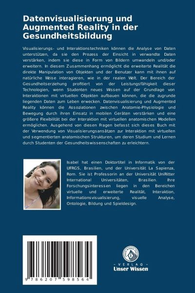 Visualisierungs- und Interaktionstechniken können die Analyse von Daten unterstützen, da sie den Prozess der Einsicht in verwandte Daten verstärken, indem sie diese in Form von Bildern umwandeln und/oder erweitern. In diesem Zusammenhang ermöglicht die erweiterte Realität die direkte Manipulation von Objekten und der Benutzer kann mit ihnen auf natürliche Weise interagieren, wie in der realen Welt. Der Bereich der Gesundheitserziehung profitiert von der Leistungsfähigkeit dieser Technologien, wenn Studenten neues Wissen auf der Grundlage von Interaktionen mit virtuellen Objekten aufbauen können, die die zugrunde liegenden Daten zum Leben erwecken. Datenvisualisierung und Augmented Reality können die Assoziationen zwischen Anatomie-Physiologie und Bewegung durch ihren Einsatz in mobilen Geräten verstärken und eine größere Flexibilität bei der Interaktion mit virtuellen anatomischen Modellen ermöglichen. Ausgehend von diesen Fragen befasst sich dieses Buch mit der Verwendung von Visualisierungsansätzen zur Interaktion mit virtuellen und segmentierten anatomischen Strukturen, um deren Studium und Lernen durch Studenten der Gesundheitswissenschaften zu erleichtern.
