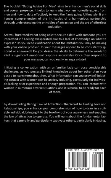 The booklet "Dating Advice For Men" aims to enhance men's social skills and overall presence. It helps to learn what women honestly expect from men and how to date effectively to keep the flame going. Ultimately, it enhances comprehension of the intricacies of a harmonious partnership through understanding the principles of attraction and the art of effortless seduction. Are you frustrated by not being able to secure a date with someone you are interested in? Feeling exasperated due to a lack of knowledge on what to express? Do you need clarification about the mistakes you may be making with your online profile? Do your messages appear to be consistently ignored or answered? Do you desire the ability to determine the words to elicit a significant emotional response accurately? Once they respond to your message, can you easily arrange a date? Initiating a conversation with an unfamiliar lady can pose considerable challenges, as you possess limited knowledge about her other than your desire to learn more about her. What information can you provide? Initiating contact with women can be anxiety-inducing, particularly for individuals lacking prior experience and enough preparation. You can interact with women in numerous diverse situations, and it is crucial to be ready for each of them. By downloading Dating: Law of Attraction- The Secret to Finding Love and Relationships, you enhance your comprehension of how to draw in a suitable individual, bringing it to the forefront of your awareness and enabling the law of attraction to operate. You will learn about the fundamental factors that generally and particularly captivate others, particularly in dating.