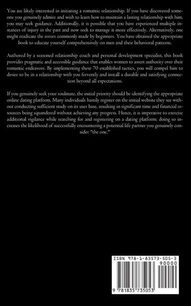 You are likely interested in initiating a romantic relationship. If you have discovered someone you genuinely admire and wish to learn how to maintain a lasting relationship with him, you may seek guidance. Additionally, it is possible that you have experienced multiple instances of injury in the past and now seek to manage it more effectively. Alternatively, one might eradicate the errors commonly made by beginners. You have obtained the appropriate book to educate yourself comprehensively on men and their behavioral patterns. Authored by a seasoned relationship coach and personal development specialist, this book provides pragmatic and accessible guidance that enables women to assert authority over their romantic endeavors. By implementing these 70 established tactics, you will compel him to desire to be in a relationship with you fervently and install a durable and satisfying connection beyond all expectations. If you genuinely seek your soulmate, the initial priority should be identifying the appropriate online dating platform. Many individuals hastily register on the initial website they see without conducting sufficient study on its user base, resulting in significant time and financial resources being squandered without achieving any progress. Hence, it is imperative to exercise additional vigilance while searching for and registering on a dating platform; doing so increases the likelihood of successfully encountering a potential life partner you genuinely consider "the one."