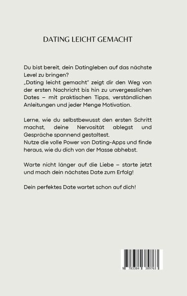 "Dating leicht gemacht: Von der ersten Nachricht bis zum perfekten Date"Du bist es leid, dich durch unzählige schlechte Dates zu kämpfen und dich dabei ständig unsicher zu fühlen?Du wünschst dir, mit Selbstbewusstsein und einem klaren Plan ins Datingleben zu starten?Dann ist "Dating leicht gemacht" der Ratgeber, den du brauchst, um deine Ängste zu überwinden und authentische Verbindungen zu schaffen.Dieses Buch begleitet dich auf deiner Reise, vom ersten Klick bis hin zu unvergesslichen Dates - Schritt für Schritt.Was du mit diesem Buch erreichst:Souverän den ersten Schritt machen: Erfahre, wie du die erste Nachricht spannend und sympathisch gestaltest, um von Anfang an einen guten Eindruck zu hinterlassen.Selbstbewusst auftreten: Lerne, wie du mit Unsicherheiten umgehst und auf Dates locker und authentisch bleibst.Dating-Profil optimieren: Hebe dich in der Welt der Dating-Apps von der Masse ab und ziehe genau die Menschen an, die wirklich zu dir passen.Mehr Freude beim Kennenlernen: Schluss mit zähen Gesprächen und peinlicher Stille - wir zeigen dir, wie du dein Gegenüber in spannende Unterhaltungen verwickelst.Erfolgreiche Dates planen: Vom ersten Treffen bis zum perfekten Date - mit unseren Tipps und Tricks wird jedes Date zu einem vollen Erfolg.