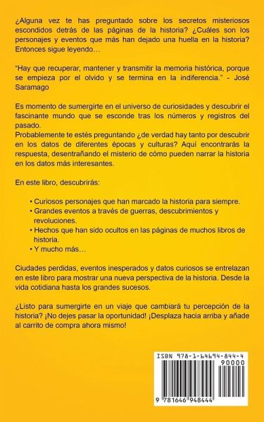 ¿Alguna vez te has preguntado sobre los secretos misteriosos escondidos detrás de las páginas de la historia? ¿Cuáles son los personajes y eventos que más han dejado una huella en la historia? Entonces sigue leyendo... "Hay que recuperar, mantener y transmitir la memoria histórica, porque se empieza por el olvido y se termina en la indiferencia." - José Saramago Es momento de sumergirte en el universo de curiosidades y descubrir el fascinante mundo que se esconde tras los números y registros del pasado. Probablemente te estés preguntando ¿de verdad hay tanto por descubrir en los datos de diferentes épocas y culturas? Aquí encontrarás la respuesta, desentrañando el misterio de cómo pueden narrar la historia en los datos más interesantes. En este libro, descubrirás: Curiosos personajes que han marcado la historia para siempre. Grandes eventos a través de guerras, descubrimientos y revoluciones. Hechos que han sido ocultos en las páginas de muchos libros de historia. Y mucho más... Ciudades perdidas, eventos inesperados y datos curiosos se entrelazan en este libro para mostrar una nueva perspectiva de la historia. Desde la vida cotidiana hasta los grandes sucesos. ¿Listo para sumergirte en un viaje que cambiará tu percepción de la historia? ¡No dejes pasar la oportunidad! ¡Desplaza hacia arriba y añade al carrito de compra ahora mismo!