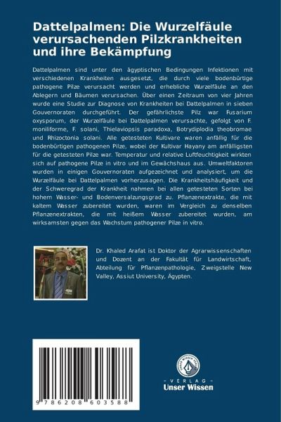 Dattelpalmen sind unter den ägyptischen Bedingungen Infektionen mit verschiedenen Krankheiten ausgesetzt, die durch viele bodenbürtige pathogene Pilze verursacht werden und erhebliche Wurzelfäule an den Ablegern und Bäumen verursachen. Über einen Zeitraum von vier Jahren wurde eine Studie zur Diagnose von Krankheiten bei Dattelpalmen in sieben Gouvernoraten durchgeführt. Der gefährlichste Pilz war Fusarium oxysporum, der Wurzelfäule bei Dattelpalmen verursachte, gefolgt von F. moniliforme, F. solani, Thielaviopsis paradoxa, Botrydiplodia theobromae und Rhizoctonia solani. Alle getesteten Kultivare waren anfällig für die bodenbürtigen pathogenen Pilze, wobei der Kultivar Hayany am anfälligsten für die getesteten Pilze war. Temperatur und relative Luftfeuchtigkeit wirkten sich auf pathogene Pilze in vitro und im Gewächshaus aus. Umweltfaktoren wurden in einigen Gouvernoraten aufgezeichnet und analysiert, um die Wurzelfäule bei Dattelpalmen vorherzusagen. Die Krankheitshäufigkeit und der Schweregrad der Krankheit nahmen bei allen getesteten Sorten bei hohem Wasser- und Bodenversalzungsgrad zu. Pflanzenextrakte, die mit kaltem Wasser zubereitet wurden, waren im Vergleich zu denselben Pflanzenextrakten, die mit heißem Wasser zubereitet wurden, am wirksamsten gegen das Wachstum pathogener Pilze in vitro.