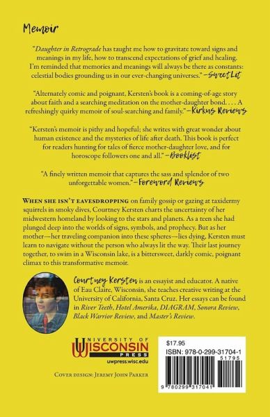 When she isn't eavesdropping on family gossip or gazing at taxidermy squirrels in smoky dives, Courtney Kersten charts the uncertainty of her midwestern homeland by looking to the stars and planets. As a teen she had plunged deep into the worlds of signs, symbols, and prophecy. But as her mother—her traveling companion into these spheres—lies dying, Kersten must learn to navigate without the person who always lit the way. Their last journey together, to swim in a Wisconsin lake, is a bittersweet, darkly comic, poignant climax to this transformative memoir.