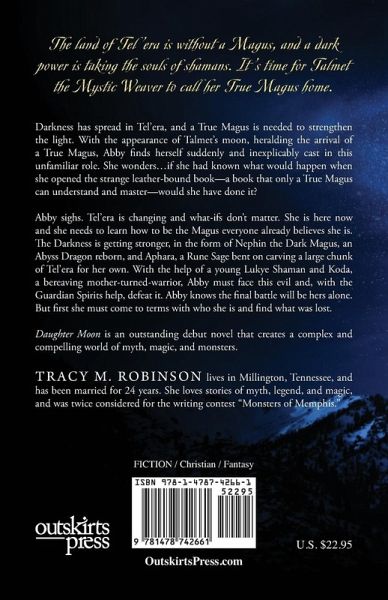 The land of Tel'era is without a Magus, and a dark power is taking the souls of shamans. It's time for Talmet the Mystic Weaver to call her True Magus home. Darkness has spread in Tel'era, and a True Magus is needed to strengthen the light. With the appearance of Talmet's moon, heralding the arrival of a True Magus, Abby finds herself suddenly and inexplicably cast in this unfamiliar role. She wonders...if she had known what would happen when she opened the strange leather-bound book-a book that only a True Magus can understand and master-would she have done it? Abby sighs. Tel'era is changing and what-ifs don't matter. She is here now and she needs to learn how to be the Magus everyone already believes she is. The Darkness is getting stronger, in the form of Nephin the Dark Magus, an Abyss Dragon reborn, and Aphara, a Rune Sage bent on carving a large chunk of Tel'era for her own. With the help of a young Lukye Shaman and Koda, a bereaving mother-turned-warrior, Abby must face this evil and, with the Guardian Spirits help, defeat it. Abby knows the final battle will be hers alone. But first she must come to terms with who she is and find what was lost. Daughter Moon is an outstanding debut novel that creates a complex and compelling world of myth, magic, and monsters.