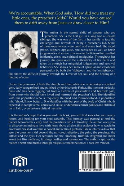 This reflection, though brutally honest, provides insight to the conflicts that face the children of ministers, pastors, religious clergy, deacons, and church leaders. It challenges fellow Christians, to nurture the lives of these children without punishing judgments. This work provokes congregants and leaders to nurture preachers¿ kids, and provide heartfelt guidance and vigilant prayer. It encourages prayer-warriors, to guard over the hearts of preachers kids. The book leads the reader toward self-examination and self-correction. The author makes a noteworthy disclaimer; I do not have a license in counseling, a degree in psychology or theology. I am not an elder or deacon in any church, nor do I hold office as a board member on any religious organization. I am not a minister, pastor or evangelist. I am neither an acclaimed author nor an authority of any kind. Forgive me if I have misquoted scripture or taken verses out of context. However I hope the Bible verses I have quoted throughout this book would not seem preachy; but then again, I am a preacher¿s daughter. I trust that, these scriptures will grab at your hearts and soothe your soul-wounds. I hope they will provide a new perspective and they would be as you have never heard them or thought of them before. The author writes from a unique perspective, that of a preacher¿s kid. I am the voice of a group that is easily misunderstood and even shunned. We are the group that, should know better. Just being born into the subculture of preachers¿ kids we are automatically judged by all, (the righteous and the unrighteous alike). We are expected to... by default, be good, be upright, make no mistakes, be all things to all men all of the time. We are to be mature in all judgments from the moment of birth, and on and on it goes. Few can comprehend our journey toward our Father on a road less traveled. This journey will be enlightening and comforting to all who read it. It will bring hope to those who are confused and lost. The book although empathetic to all parties, makes all accountable for their behaviors toward others and to the Heavenly Father. It is with great love and sensitivity that the author leads the reader to finding relationship with Jesus. Just for a moment, the reader can walk in the shoes of preachers¿ kids with understanding and empathy. It brings much-needed direction and guidance. The author attempts to bridge the gap between all of you and preachers¿ kids. It also attempts to reconcile the disconnection between preachers¿ kids and Jesus. This work is raw and honest. It is a reflection of a lost generation who need to know the true power of redemption and the priceless gift of grace and love.