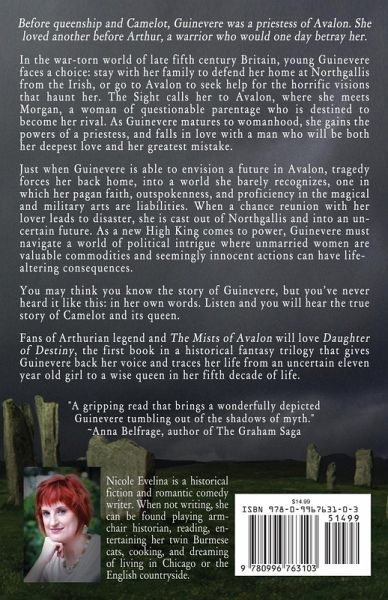 Before queenship and Camelot, Guinevere was a priestess of Avalon. She loved another before Arthur, a warrior who would one day betray her. In the war-torn world of late fifth century Britain, young Guinevere faces a choice: stay with her family to defend her home at Northgallis from the Irish, or go to Avalon to seek help for the horrific visions that haunt her. The Sight calls her to Avalon, where she meets Morgan, a woman of questionable parentage who is destined to become her rival. As Guinevere matures to womanhood, she gains the powers of a priestess, and falls in love with a man who will be both her deepest love and her greatest mistake. Just when Guinevere is able to envision a future in Avalon, tragedy forces her back home, into a world she barely recognizes, one in which her pagan faith, outspokenness, and proficiency in the magical and military arts are liabilities. When a chance reunion with her lover leads to disaster, she is cast out of Northgallis and into an uncertain future. As a new High King comes to power, Guinevere must navigate a world of political intrigue where unmarried women are valuable commodities and seemingly innocent actions can have life-altering consequences. You may think you know the story of Guinevere, but you've never heard it like this: in her own words. Listen and you will hear the true story of Camelot and its queen. Fans of Arthurian legend and the Mists of Avalon will love Daughter of Destiny, the first book in a historical fantasy trilogy that gives Guinevere back her voice and traces her life from an uncertain eleven year old girl to a wise queen in her fifth decade of life.