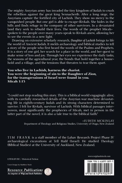 The mighty Assyrian army has invaded the tiny kingdom of Judah to crush the rebellion against the great king Sennacherib. After a long siege, the Assyrians capture the fortified city of Lachish. They show no mercy to the vanquished people. But one girl is able to escape-Rivkah. She hides in the hills and finds refuge in the company of other survivors. In a devastated land they seek to rebuild their lives. The words of the prophet Micah-spoken to the people over many years-speak to Rivkah anew, allowing her to see the events in a new light. Drawing on extensive scholarly research, Daughter of Lachish brings to life the world of Ancient Judah. It melds archaeology and biblical studies to tell a story of the people who first heard the words of the Psalms and Prophets. It is a story of one girl, her search for a place in the world, and her quest to make sense of loss and joy. Through her eyes we experience the daily tasks, the seasons of the agricultural year, the bonds that hold together a household and a village, and the tensions that threaten to tear them apart. You who live in Lachish, harness the chariot. You were the beginning of sin to the Daughter of Zion, for the transgressions of Israel were found in you. Micah 1:13
